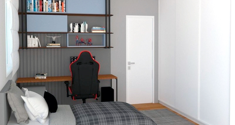 Gabriel, menino estudioso, gosta de ler e música. Sua demanda foi espaço para guardar muitos livros, guitarra e violão. Pediu que as cores fossem neutras para escura.
