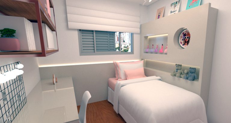 Quartos propostos para atender todas as necessidades das crianças, com cama, bancada de estudo, TV e armários.